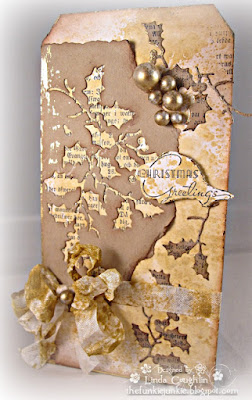 The Holly die cut layer is Evergreen Bough spray along with a misting of Perfect Pearl mist in Heirloom Gold. I tore the paper and edged in Frayed Burlap. I added Stickles 'berries'. Like Linda, I also stamped my holly cuts as well as foiled them. I embossed a Flonz Craft greeting in gold, and added a back panel embossed with a sparkly gold powder.