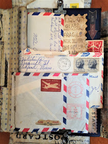 I've simply, yet stratigically,  adhered another envelope to the second flap, so that it allows just what I want seen beneath it to peek out. The opened letter to the left is what's kept inside. I love pulling out this old  letter and feeling the paper--it's a vellum paper embossed with a lovely botanical design.
